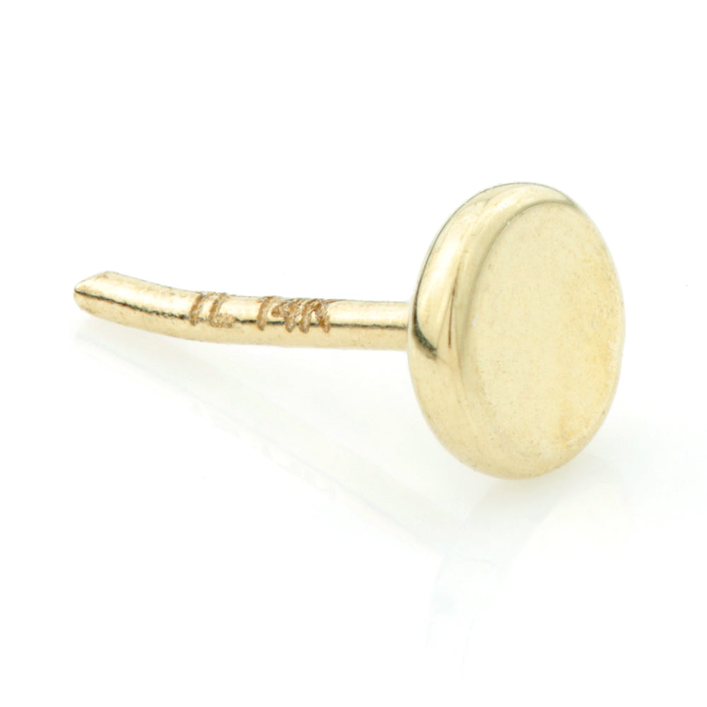 TISH LYON® 14ct Gold Disk Threadless Attachment - To fit PopT16Stem Size: 3mm 0.5mm Threadless / 1.2mm Bar Gold: Yellow Packaged in small grey presentation box/card Suitable for initial piercing