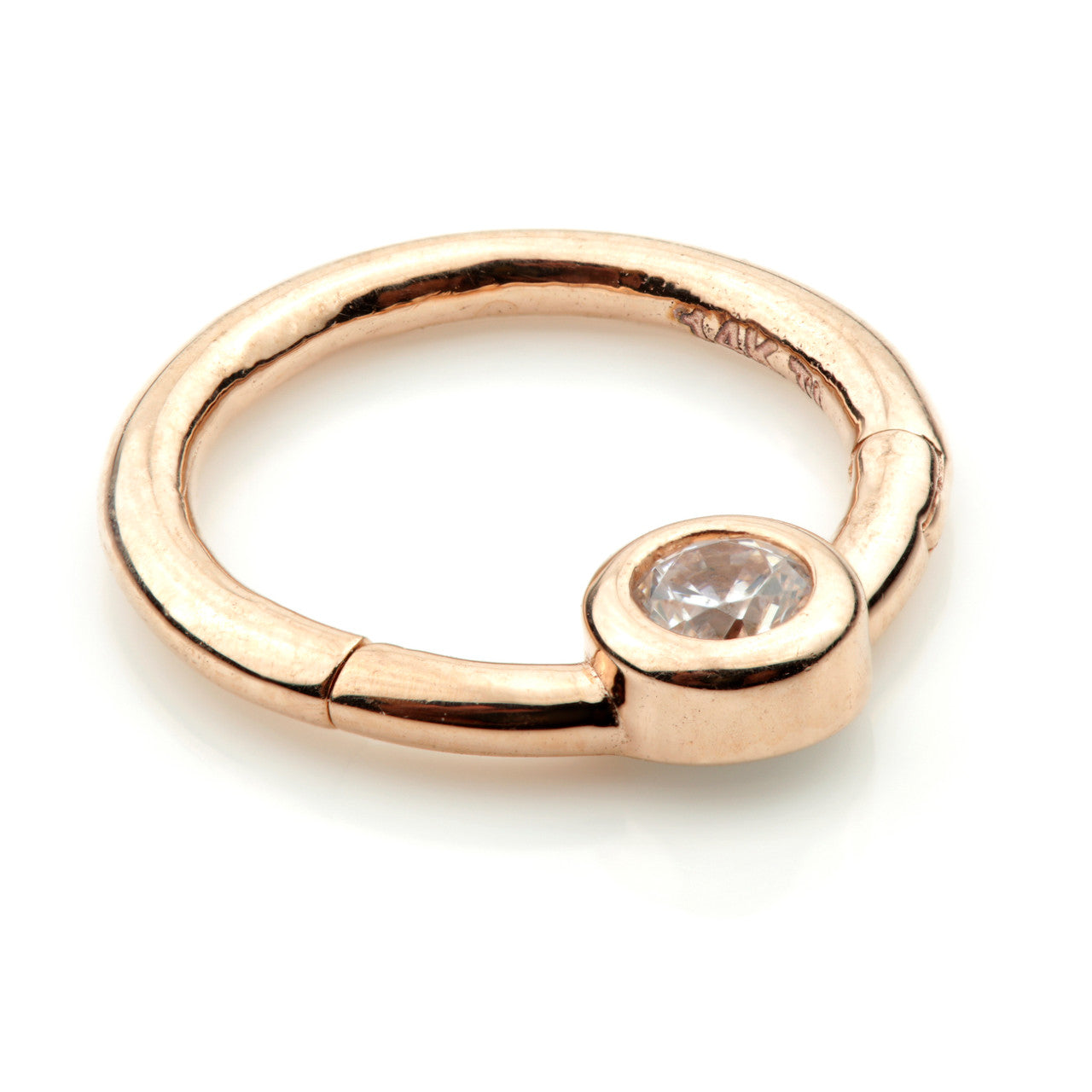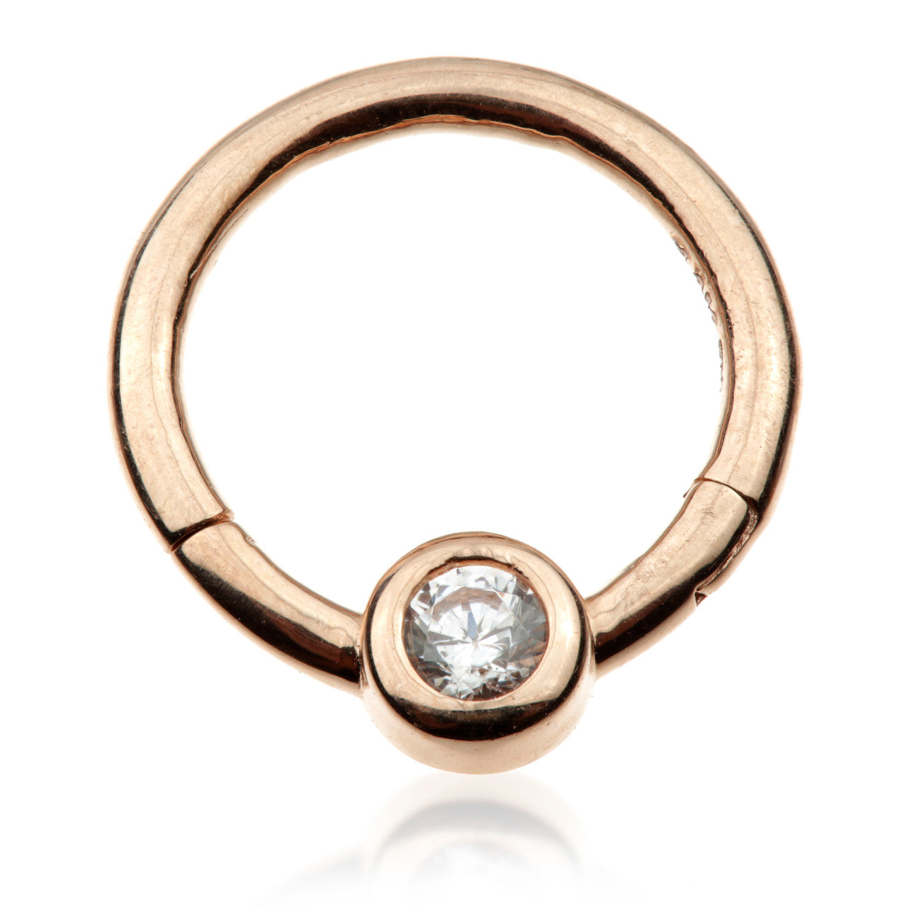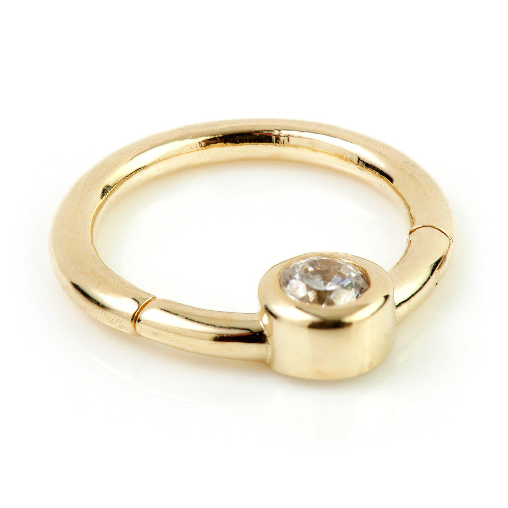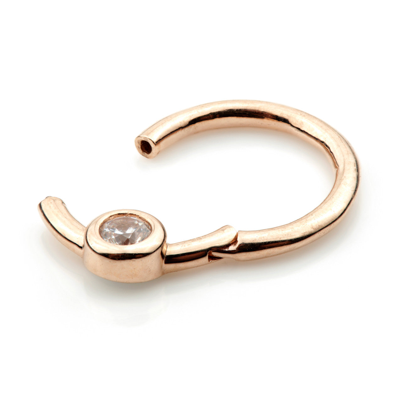 TISH LYON - Front Facing BCR Gem Style Hinge Segment Ring 9ct or 14ct Yellow, White or Rose Gold (with white balck plate to stop rubbing for smiley piercing) 1x CZ Crystal Gems Size: 1.2mm x 8mm Weight: 0.53gm For Septum, Cartilage, Tragus, Smily etc Packaged in small grey presentation box. 14ct Suitable for initial piercing or in the mouth.