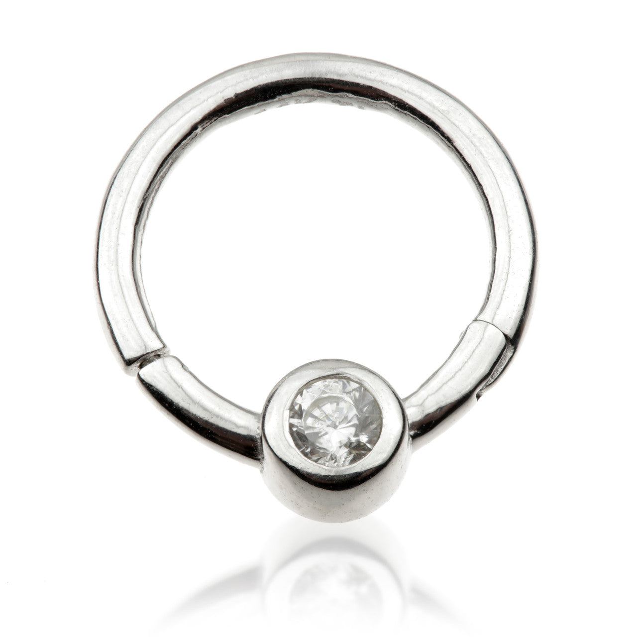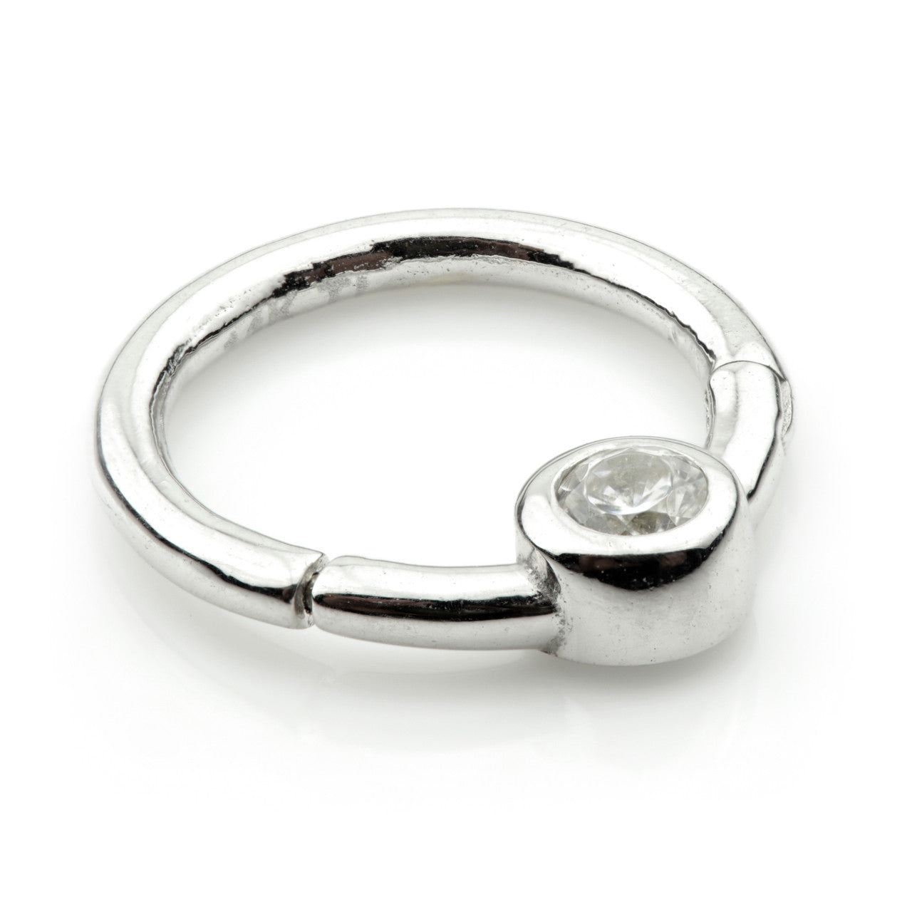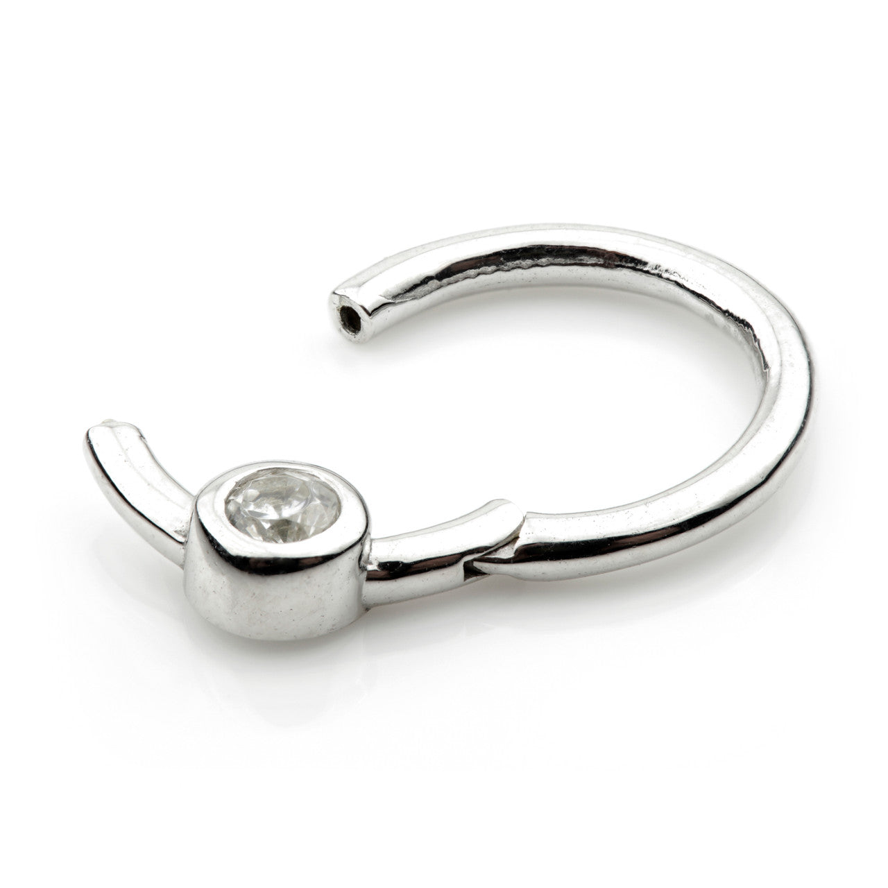 TISH LYON - Front Facing BCR Gem Style Hinge Segment Ring 9ct or 14ct Yellow, White or Rose Gold (with white balck plate to stop rubbing for smiley piercing) 1x CZ Crystal Gems Size: 1.2mm x 8mm Weight: 0.53gm For Septum, Cartilage, Tragus, Smily etc Packaged in small grey presentation box. 14ct Suitable for initial piercing or in the mouth.